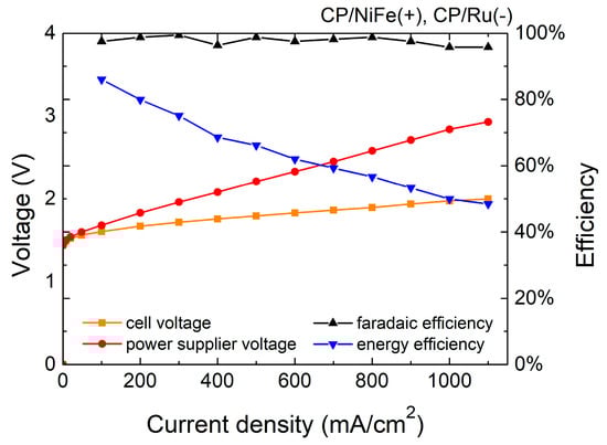 Efficiency of NiFe(+)/Ru(−) electrolyzer.