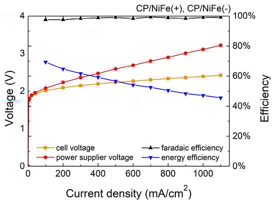 Efficiency of NiFe(+)/NiFe(−) electrolyzer.
