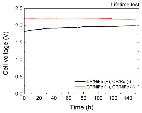 Figure 5 and Table 2 show the stability of the electrolyzer. In addition to having excellent catalytic performance, long-term stability is also a crucial factor to consider when manufacturing practical electrolyzers. The current density was fixed at 400 mA/cm2 to test the lifetime of the electrolyzer. After performing the test for 150 h, the cell voltage of NiFe(+)/Ru(−) increased by 0.167 V. This might be caused by the degradation of the catalysts. In comparison, NiFe(+)/NiFe(−) showed almost no decline after performing a test for 150 h. The cell voltage decreased slightly by 0.010 V.