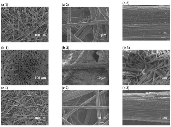 SEM images with 100×, 1000×, and 10,000× magnification. (a-1)–(a-3) CP, (b-1)–(b-3) CP/NiFe, and (c-1)–(c-3) CP/Ru.