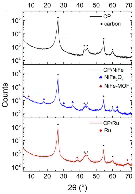 XRD was used to analyze the crystal structure of the material. Figure 7 shows the XRD spectra of electrocatalysts. CP is mainly made of graphite, and it showed two primary peaks at 26.6° and 54.6° (JCPDS card no. 00-012-0212) []. Cui et al. showed that a new characteristic peak will appear at 8.8° when the NiFe-layered double hydroxide (NiFe-LDH) layer is completely turned into NiFe-MOF. A tiny peak at 8.8° corresponds to the (200) plane of NiFe-MOF []. CP/NiFe mainly exhibits a NiFe2O4 phase. The XRD spectra of CP/NiFe show five diffraction peaks at 17.8°, 30.1°, 35.6°, 58.1°, and 63.2° corresponding to the (111), (220), (311), (511), and (440) planes, respectively, of NiFe2O4 (JCPDS card no. 86-2667) []. In CP/Ru electrocatalysts, the XRD spectra show the hexagonal structure of Ru. The three diffraction peaks at 38.4°, 43.9°, and 69.5° corresponding to the (100), (101), and (110) planes, respectively, can be observed clearly (JCPDS card no. 89-3942) [,].