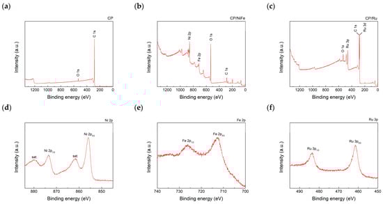 XPS wide-scan spectra of (a) CP, (b) CP/NiFe, and (c) CP/Ru. XPS fine-scan spectra of (d) Ni2p on CP/NiFe, (e) Fe2p on CP/NiFe, and (f) Ru3p on CP/Ru.