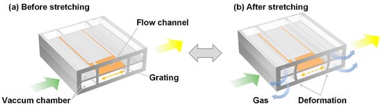 The development of stretchable microfluidic chips has gained significant attention due to their advantages in providing innovative solutions for flexible and adaptable biomedical devices [34,35]. For instance, hydrodynamic manipulation in microfluidics can effectively separate particles by size, and when coupled with external mechanical tuning, can enhance separation performance [36,37,38]. However, the application of external mechanical forces often poses challenges to the stability and reliability of the chips, which can interfere with other integrated functional units. As a result, researchers are now exploring the development of microfluidic chips that enable precise tunability and localized deformation. The emergence of organ-on-a-chip technology has significantly advanced the recreation of human physiological systems on microfluidic platforms [39]. To mimic physiological motions like breathing, peristalsis, and vascular biomechanics, a precisely controlled mechanical stretching method was developed to meet the demands of organ chips [39,40,41]. This method inspired us to develop a novel strategy to integrate vacuum chambers with thin-film DFB structures as a dye laser tuning mechanism. This integration offers improved precision and efficiency in dye laser generation and wavelength tuning.