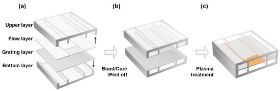 Specifically, the detailed fabrication process is presented in Figure S1. The chamber molding master was prepared using negative photoresist SU-8 2075 via contact lithography with an EVG mask aligner (EVG 610, EV Group, St. Florian am Inn, Austria). Both the upper and bottom chambers, with the same height of 150 µm, were obtained by coating PDMS prepolymer (RTV 615, GE, 10:1 w/w ratio) onto the mold. For the creation of the 1.2 µm height flow channel, we employed an AZ 5214 photolithography approach. The grating mold (417 nm period, 50% pitch) was manufactured through nanoimprint lithography. Subsequently, the grating and flow layers, 30 µm in thickness, were achieved via spin-coating the PDMS prepolymer (RTV 615, GE, 5:1 w/w ratio) on their respective molds. To delicately peel off the thin film from the mold, we employed the double-layer PDMS method, followed by a longer thermal bonding process. After oxygen plasma treatment using a reactive ion etcher (RIE-10NR, Samco, Kyoto, Japan), the channel layer, coupled with the top chamber, was meticulously aligned; this was bonded to the grating layer housing the bottom chamber under a stereoscope (SZ61, Olympus, Tokyo, Japan). The entire bonded optofluidic dye laser device was obtained following a curing process at 80 °C overnight in an oven. Mirror treatment on the chip side walls was implemented for efficient dye excitation, following the approach outlined in Ref. [42].