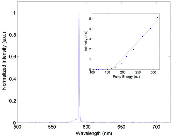 First, we characterized the optofluidic dye laser device before tuning. A typical lasing spectrum above the pumping threshold is shown in Figure 3. The laser emission appears at the wavelength of 588.84 nm with a measured linewidth of 0.15 nm (limited by the spectrometer resolution). The inset depicts the plot of pumping pulse energy versus output pulse, revealing a threshold pump energy of 164.86 nJ/pulse.