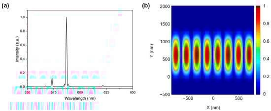To understand the second-order DFB modes, an optical simulation was carried out using Lumerical software (8.19.1584), based on the finite-difference time-domain (FDTD) method. In these simulations, the laser produced by the fluorescent dye was modeled by placing multiple random electric dipole sources in the 550–650 nm range within the resonance chamber to excite the periodic unit cell structure. The refractive index of the fluorescence liquid in the resonance chamber was 1.420, and the refractive index of PDMS at 588 nm was 1.412, according to commercial datasheets. Two modes at the wavelengths of 573.50 nm and 587.23 nm were observed in the simulated spectrum in Figure 4a. A robust and narrow peak at 588 nm, consistent with experimental results, was observed, while the other resonance mode with a higher threshold energy was not observed in the experiment. The theoretical simulation suggested that the field distribution of the Eigen mode is predominantly confined within the resonance chamber with the active waveguide layer, as depicted in Figure 4b.