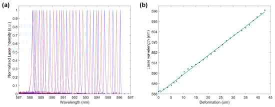 A normalized lasing spectrum at 32 different wavelengths was demonstrated in Figure 5a, showcasing highly robust and flexible tunability. The laser emission spectra graph demonstrated a tuning range of 7.84 nm, covering wavelengths from 588 nm to 596 nm in a single-mode operation. Although the PDMS membrane is capable of producing up to ~50% deformation, only 1.28% deformation was utilized to ensure single-mode lasing operation. If the stretched grating period falls outside the range, the supported resonance does not overlap with the gain medium, and the lasing appears to be very weak.