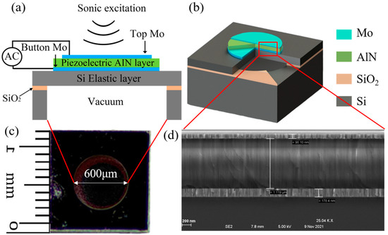 (a) Cross-sectional view and excitation schematic of an individual PMUT. (b) Lateral 3-D schematic of a PMUT in this design. (c) Physical image of PMUT back cavity. (d) Zoomed-in view HIM image of the cross-sectional structure of the released membrane.