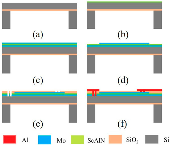 The fabrication process of the PMUT starts from a silicon-on-insulator (SOI) wafer, silicon support layer thickness of 4 μm (Figure 2a). Prior to the deposition of Mo/ScAlN/Mo stack, an AlN seeding layer is deposited (Figure 2b). Next, 0.1 μm Mo/1 μm ScAlN/0.2 μm Mo stack on the ScAlN seeding layer by using magnetron sputtering deposition (Figure 2c). The top Mo layer is formed by plasma etching (Figure 2d). An oxide layer is deposited to form the isolation layer, followed by the etching of SiO2 and ScAlN to pattern the via opening for the top and bottom electrodes (Figure 2e). Deposition and patterning of aluminum (Al) leads and bonding pads (Figure 2f).