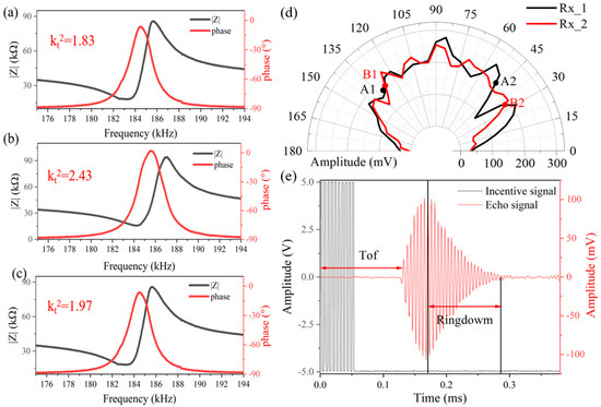 Figure 3a–c shows the electric properties of the fabricated PMUT. The impedance and phase were measured by an impedance analyzer (Keysight E4990A). The results show that the resonant frequencies of the PMUT in air for the three devices measured by the impedance analyzer are 183.025 kHz, 184.281 kHz, and 183.093 kHz, respectively. The electromechanical coupling factor () can be estimated by approximating the following equation: