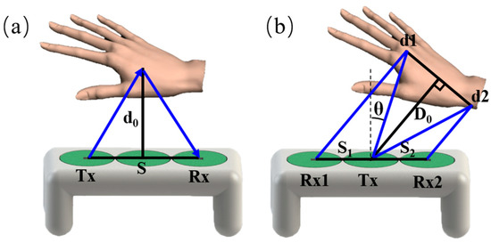 When the angle between the object and the device is , distance measurement can be achieved by using one transmitter Tx and two receivers (Rx1 and Rx2). As Figure 4b, and received by Rx1 and Rx2 it can be expressed as