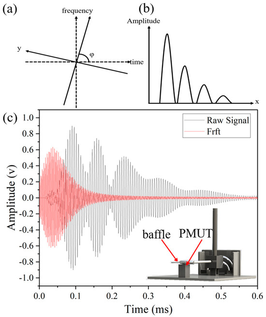 (a) Clockwise rotation of time-frequency plane (t–f) by angle, φ, through the use of the FrFT, forming a new reference plane, (x–y). (b) After the appropriate angle φ is selected, it can be seen in the fractional domain of that after the FrFT, the multiple echoes are not mixed together. (c) Echo signal when the baffle is right next to the device (black) and the primary echo extracted by FrFT (red).