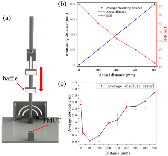 Figure 7a illustrates the experimental setup where the ultrasound module is centrally positioned on the rotary displacement platform, and the reflective plate is lowered from an elevated position downwards. To characterize the module’s capacity for positioning over various distances, the rotary displacement platform is gradually lowered in increments of 100 mm. The distance information is recorded and the signal-to-noise ratio (SNR) is calculated by [24]