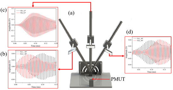 (a) The experimental environment of variable azimuth angles used in the experiment. (b) The signal waveform received by the Rx1 and Rx2 when baffle is 200 mm above Tx and −40° near the Rx1, (c) 0° directly above the Tx, (d) 40° near the Rx2.