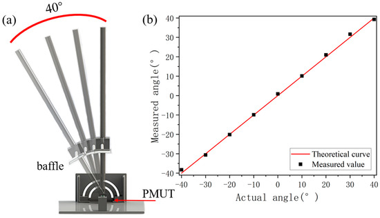 To capture the angular information of an object, data were collected at various angles at a consistent distance, and the performance was analyzed. Figure 9a illustrates the experiment setup. The ultrasound module is centrally placed on a rotating displacement platform, and the reflector plate is incrementally moved from left to right. The difference in time of flight (Dtof) is determined by calculating the point disparities in time between the two receiving ends, subsequently allowing for angle calculation via Equation (7). To characterize the range of angles at which the ultrasound module can operate, the rotating platform was gently shifted in increments of 10°. Figure 9b presents a comparison between the acquired angle information during lateral movement and the actual angles. The findings reveal that the ultrasound module described in this study can effectively localize angles within a range of plus and minus 40°.