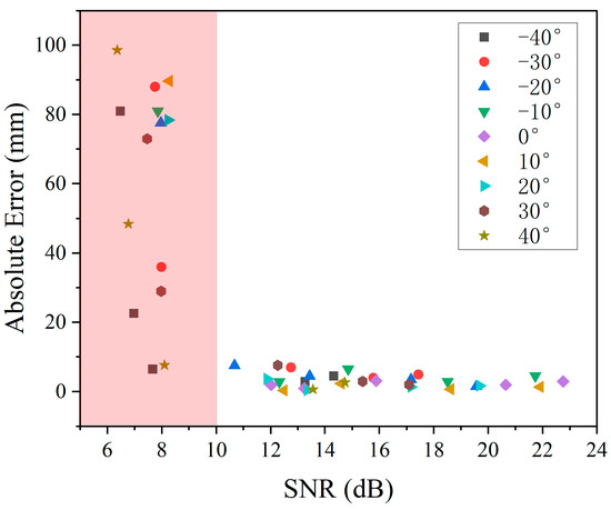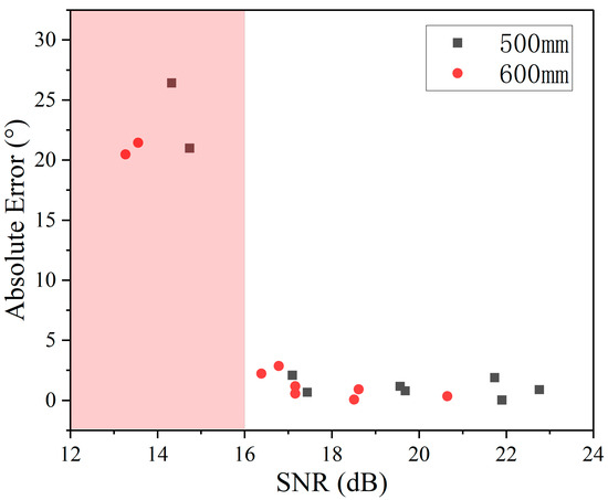 From Figure 11, it can be concluded that due to the angle measurement for the sound intensity requirements are higher. A SNR less than 16 dB results in an angle measurement error greater than 3°, rendering such an angle effectively unmeasurable. As a result, the absolute error of the angle at different distances is obtained as shown in Table 2, when the straight line distance is 100–400 mm, the maximum error of the measurable angle is 2.871° at (400 mm, −30°), when the straight line distance is 500–600 mm, the maximum error of the measurable angle is 2.847° at (600 mm, −30°).