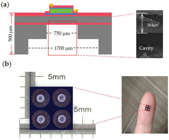 (a) Proposed PMUT, 2D structure schematic, and SEM backside cavity height localized view. (b) Optical microscopic top view of the backside cavity structure.