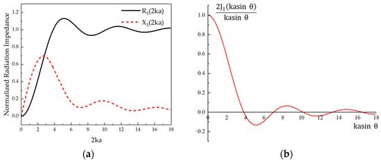 where J1 and K1 are the first-order Bessel and first-order Struve functions, and the radiation impedance is normalized as shown in Figure 2a [21], where the real part R1 is the radiation resistance, which determines the energy coupled to the medium by the PMUT, the imaginary part X1 is the radiation resistance, ρ0 is the density of the medium, c0 is the propagation speed of the acoustic wave in the medium, k is the number of waves, a and aeff are the radius and the effective radius of the PMUT. Am is determined by the radius of the opening at the end of the backside cavity. The average radiated power can be obtained as (4) [20].