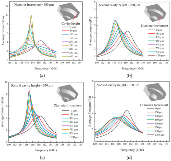 Average sound pressure results of FEM simulation at 3λ below the PMUT resonance cavity: (a) Di = 950 μm, varying the height of the dilatation tube; (b) Hc = 250 μm, varying the incremental diameter of the dilatation tube; (c) Hc = 350 μm, varying the incremental diameter of the dilatation tube; (d) Hc = 150 μm, varying the incremental diameter of the dilatation tube.