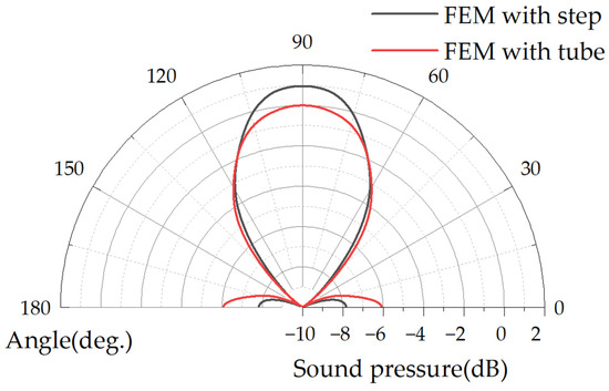 FEM simulated far-field SPL directivity normalized plot: red line is tube PMUT with 0 diameter increment at the end of the cavity; black line is stepped-tube PMUT with 950 μm diameter increment at the end of the cavity and 250 μm second backside cavity height.