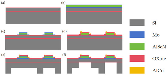 Process flow for fabrication of ultrasonic transducers with stepped-tube backside cavities based on Sc0.2AI0.8N films on eight-inch wafers: (a) starting from SOI wafers; (b) deposition of Sc0.096AI0.904N/Mo/Sc0.2AI0.8N/Mo stacks; (c) top Mo, Sc0.2AI0.8N, bottom Mo, dry etch patterning of the seed layer, Sc0.096AI0.904N; (d) PECVD deposition, through-hole via etching, aluminum-copper alloy deposition and etching for PMUT metallization interconnections; (e) backside large cavity 250 μm DRIE silicon etching; (f) backside tiny cavity silicon and SiO2 etching to release the membrane.