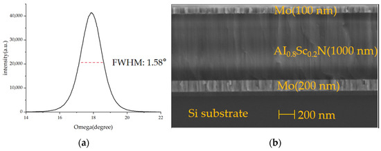 As shown in the process flow in Figure 5, an eight-inch silicon-on-insulator (SOI) wafer, with a top silicon thickness of 4 μm and a buried oxygen layer of 500 nm, is used for this work. First, a 300 nm layer of SiO2 is deposited on the surface with PECVD as a dielectric layer. Before the first deposition, the wafer needs to undergo pretreatment at a high temperature of 450 °C for 5 min under vacuum. This process is designed to remove impurities and water vapor adhered to the SOI wafer [25]. Then, a one-step deposition of Sc0.096AI0.904N/Mo/Sc0.2AI0.8N/Mo stacked layers was carried out. The XRD and SEM results are shown in Figure 6. The full width at half-maximum (FWHM) value of 1.58° indicates that our deposited Sc0.2AI0.8N films have good crystalline quality, in which Sc0.096AI0.904N serves as the seed layer, which is favorable for the subsequent deposition of highly oriented films with the (002) orientation. This reduces the surface roughness of the Sc0.2AI0.8N film [16]. The resulting piezoelectric coefficients for the Sc0.2Al0.8N samples were d33~9 pm/V and d31~−4 pm/V by the cantilever method. The seed layer, Mo electrode layer, and Sc0.2AI0.8N were all deposited using the Sigma® Standard PVD (Sigma® Deposition System from SPTS, Newport, UK). Pure Mo targets were used for the deposition under the Ar atmosphere, and an AI0.8Sc0.2 alloy target was used for the deposition of the Sc0.2AI0.8N layer under the Ar/N2 atmosphere.