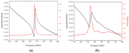 Device characteristics: (a) Tube PMUT electrical impedance characteristics; (b) Stepped-tube PMUT electrical impedance characteristics.
