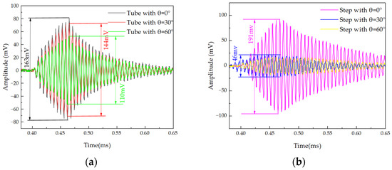 The transmission performance of two PMUT structures was compared using the experimental setup shown in Figure 8. The experimental setup consisted of a rotating platform for PMUT, a function generator, a digital storage oscilloscope, a standard commercial microphone (CM16/CMPA, 2–200 kHz, Avisoft Bioacoustics Co., Ltd., Glienicke/Nordbahn, Germany), and a scale to measure shift distance. The PMUT was fixed onto the platform base, and the distance and angle between the sensor and the microphone could be adjusted by moving and rotating the bottom platform. During the experiment, the microphone was positioned 20 cm in front of the PMUT. The PMUT was driven by a function generator at its resonant frequency. The function generator produced 10 Vpp pulsed continuous square waves with a period of 10 cycles. The ultrasonic waves emitted by the PMUT propagated through the air and were received by the microphone. The received waves were then displayed on an oscilloscope. By rotating the circular bottom platform, the center axis of the PMUT and the microphone is set at 0°, 30°, and 60° when the acoustic time-domain characterization is shown in Figure 9. In the same experimental environment, the acoustic energy at the front end of the PMUT in the stepped-tube backside cavity was more concentrated. The acoustic pressure was increased by 17% compared to that of the tube backside cavity. Compared to when the microphone and the PMUT were at 0°, the amplitude of the measured signal in the stepped-tube backside cavity were reduced by 75% and 81% when the PMUT was positioned at angles of 30° and 60°, respectively. In contrast, the amplitude signal of the tube backside cavity structure is only reduced by 11% and 32%.