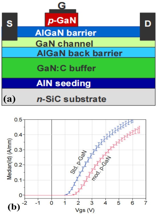 In order to realize an enhancement-mode p-GaN HEMT device while increasing its breakdown voltage, Hilt et al. combined the inserted p-GaN layer with the AlGaN back barrier, adopting AlGaN as the epitaxial layer to function as the back barrier to suppress the penetration current between the source and drain in the off-state [,], as shown in Figure 3. The fabricated device achieved 1.78 V threshold voltage and 350 mA/mm saturation output current, and its off-state breakdown voltage exceeded 1000 V. The used GaN:C-buffer in combination with the AlGaN back barrier gave a very high breakdown strength to the devices that scaled with 170 V/µm gate-drain distance. Since the device can be categorized as a conventional p-GaN in terms of structure, its threshold voltage is not high enough, its gate-breakdown voltage is relatively low, and a large gate-leakage current still exists.