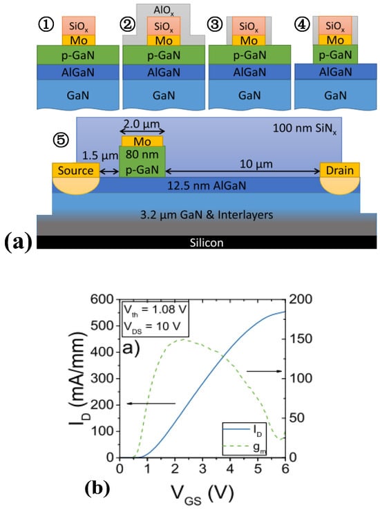 (a) Structural diagram and (b) transfer characteristic curve of p-GaN HEMT device adopting gate-first process []. Reprinted/adapted with permission from Ref. []. 2018, IEEE.