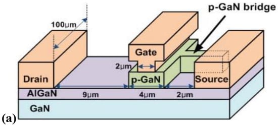 Subsequently, Uemoto et al. used p-AlGaN as the gate material to grow a layer of p-AlGaN on the AlGaN barrier. The inductively coupled plasma (ICP) etching technology was then used to remove the p-AlGaN that existed between the gate–source bridge and the gate drain, during which the p-AlGaN of the gate was used to exhaust the 2DEG [,], as shown in Figure 2. This approach utilizes a hole injection effect to realize enhancement-mode characteristics of the device, so this type of device is also known as a gate injection transistor (GIT). At the gate voltage of 0 V, the channel under the gate is fully depleted, and the drain current does not flow. At the gate voltages up to the forward built-in voltage of the p–n junction, the GIT is operated as a field-effect transistor. A further increase in the gate voltage exceeds the results of the hole injection to the channel from the p-AlGaN. The injected holes accumulate an equal number of electrons that flow from the source to keep charge neutrality at the channel. The accumulated electrons are moved by the drain bias with high mobility, while the injected holes stay around the gate because the hole mobility is at least two orders of magnitude lower than that of the electron. This conductivity modulation results in a significant increase in the drain current.