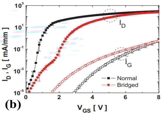 Based upon the existing research on the gate–source bridge, Hua et al. introduced a gate–source bridge between the gate and the source of p-GaN HEMT [], and adopted a p-type ohmic contact near the source and a p-type bridge, an oxide layer below the gate–source bridge also being introduced. The metal–insulator–semiconductor (MIS) structure formed by the oxide layer with metal and with p-GaN can divide the voltage, while the lower trap state on the surface of p-GaN can effectively reduce the gate-leakage current. As shown in Figure 9, by adjusting the p-type doped field-effect transistor (p-FET) bridge with different depths of the recessed gate, the threshold voltage of the fabricated device is increased from 3.6 V to 8.2 V.