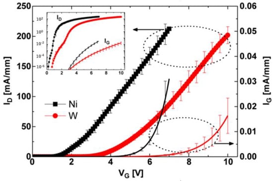 Transfer characteristic curve of p-GaN HEMT device with tungsten gate []. Reprinted/adapted with permission from Ref. []. 2013, IEEE.