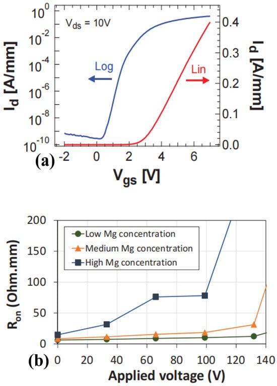 p-GaN HEMT device and (a) its transfer characteristic curve and (b) the curve of specific on-resistance varying with Mg2+ concentration []. Reprinted/adapted with permission from Ref. []. 2016, IEEE.