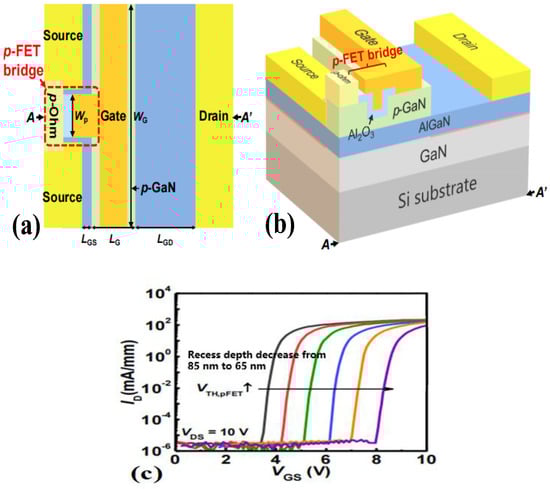 Gate–source bridge p-GaN HEMT device and (a) its vertical view, (b) three-dimensional structural diagram, and (c) transfer characteristic curves of p-FET bridges with different depths of recessed gate []. Reprinted/adapted with permission from Ref. []. 2020, IEEE.