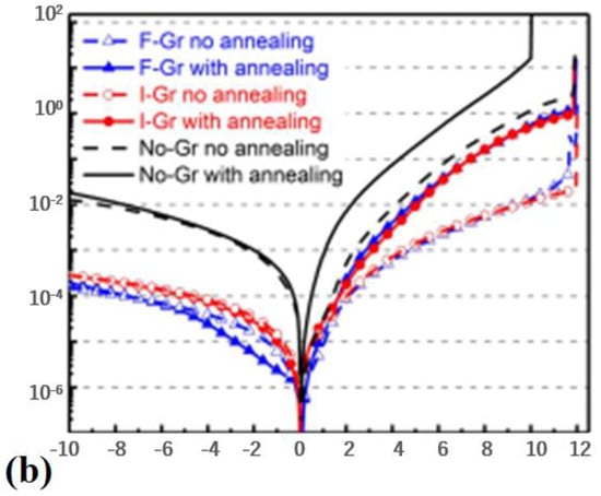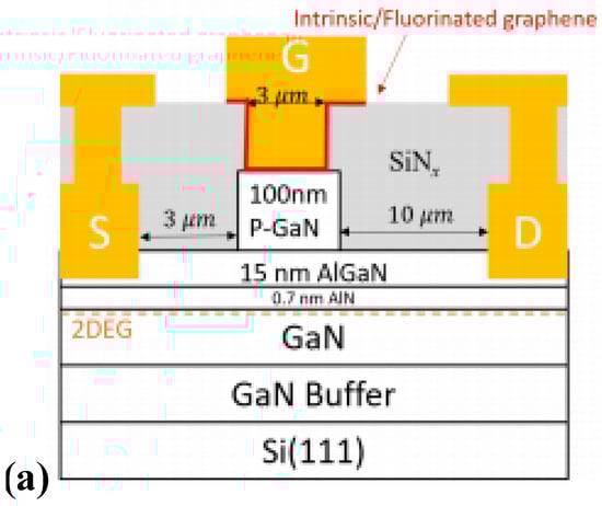 Regarding the p-GaN HEMT device with a Schottky gate, one of the most effective methods to improve the gate-breakdown voltage is increasing the height of its Schottky barrier []. As shown in Figure 10, Zhou et al. adopted fluorographene and titanium as the metal for fabricating the gate of a p-GaN HEMT device []. Different from conventional metal gate devices, fluorographene increases the Schottky barrier height of the fabricated device by 0.24 eV, thereby effectively improving the threshold voltage of the device. Furthermore, the interface quality of the device is improved accordingly, lowering the surface electron density state of p-GaN HEMT effectively. By applying the above technique, the off-state leakage current of the device is reduced by 50 times, and its gate-breakdown voltage achieves 12.1 V, exhibiting excellent temperature stability.