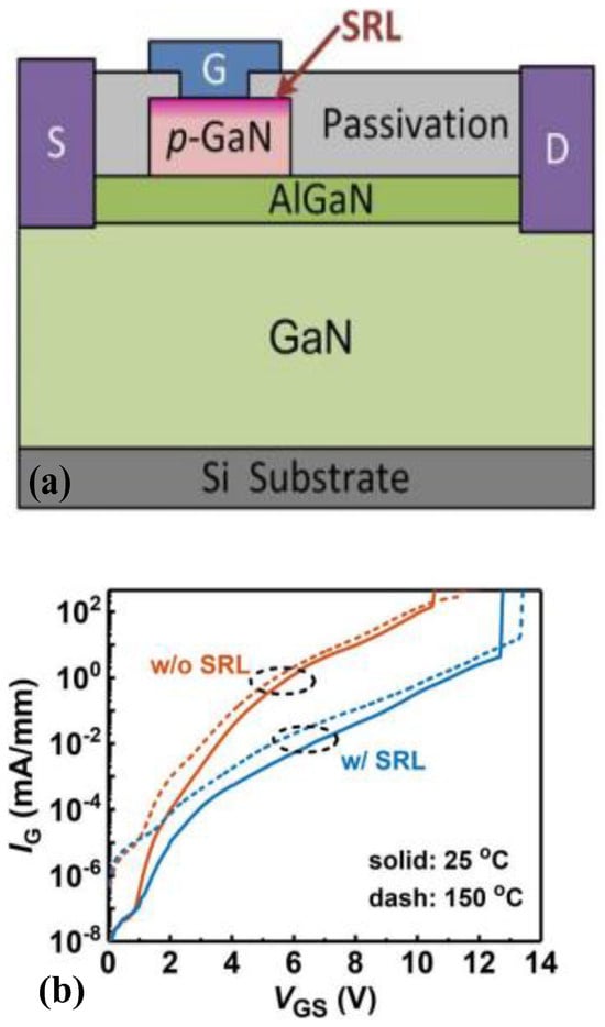 Research on the surface processing of p-GaN to improve the gate-breakdown voltage has also attracted much attention. Zhang et al. transformed several nanometers of p-GaN near the gate surface into GaON, forming a surface-reinforcement layer (SRL) []. Specifically, this approach adopts oxygen plasma processing before depositing metal on the surface of the p-GaN gate, after which the gate is annealed at 800 °C to reconstruct its surface. The surface reconstruction can significantly reduce the trapped surface charges of p-GaN, thereby reducing the gate leakage of the device. In addition, the GaON formed on the gate surface of the device can be approximately equivalent to a very thin passivation layer, which forms a structure similar to MIS, thereby effectively dividing the voltage. It can be observed from Figure 12 that, through adopting this technology, the gate-leakage current of the device is reduced by two orders of magnitude, while the gate-breakdown voltage is increased from 10.5 V to 12.7 V. With the Fowler–Nordheim tunneling fitting of IG-VGS curves at high VGS, a higher Schottky barrier height of 1.1 eV could be extracted for the device with SRL compared with 0.6 eV of the device without SRL. The higher Schottky barrier height potentially indicates a wider bandgap of GaON. A maximum gate-breakdown voltage of 7.8 V could be obtained for devices with SRL for a 10-year lifetime at a failure level of 1%, which is much higher than the 5.9 V of devices without SRL.