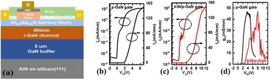 The in situ-grown p-GaN gate dielectric is also an effective alternative to increase the threshold voltage and gate-breakdown voltage of a p-GaN HEMT device. By in situ growing an AlN dielectric layer on the p-GaN cap layer, Wu et al. improved the reliability of the gate []. As shown in Figure 14, the in situ AlN layer is capable of modulating the energy band without introducing trapped surface charges at the AlN/p-GaN interface. Moreover, the in situ AlN layer can also divide the voltage, increasing the gate-breakdown voltage effectively. However, the in situ AlN also has drawbacks. The AlN material’s high stress can easily lead to defects and dislocations, and its quality can be further improved by optimizing its thickness and growth condition.