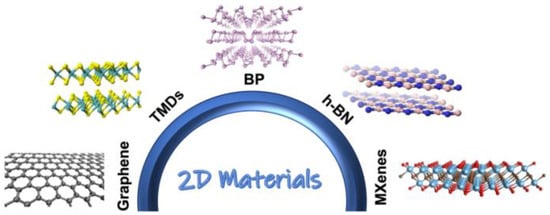 Major classes of 2D materials considered in this review: Graphene, TMDs, BP, h-BN, and MXenes. Reproduced with permission from [7].