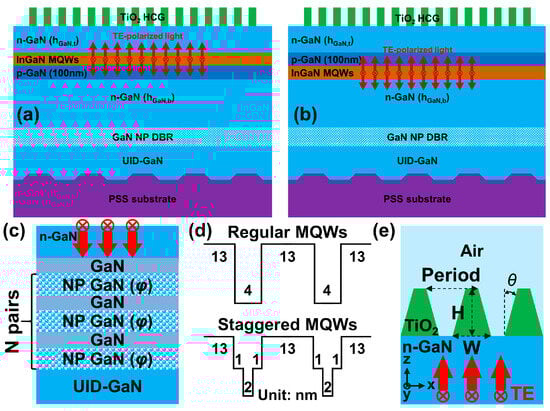 Schematic drawings of proposed InGaN-based red VCSELs with nanoporous (NP) GaN DBR and TiO2 HCG for (a) simulation sample 1: n-p-i-n structure design and (b) simulation sample 2: n-i-p-n structure design. The simulation model sketches of (c) NP GaN DBR, (d) regular and staggered MQWs, the numbers 13, 4, 2 and 1 represent the thickness of each InGaN layer, and (e) TiO2 HCG deposited on the n-GaN layer. The red arrows in (a–c,e) indicate the simplified diagrams of incident lights with TE polarization.