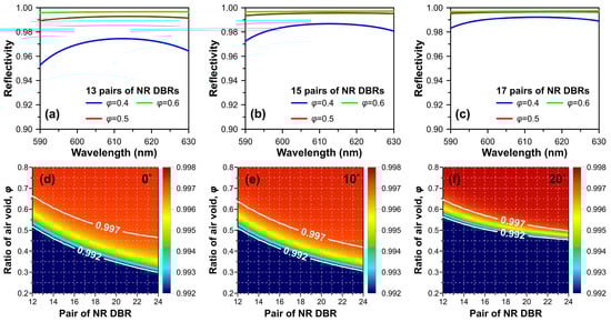 To prevent the overestimation of reflective capability, we assumed an absorption loss of 30 cm−1 inside the NP n-doped GaN induced by free-carrier absorption and irregularly distributed air voids for simplification. The reflectivity spectra for 13, 15, and 17 pairs of NP GaN DBRs under normal incidence for three kinds of air voids ratios, φ = 0.4, φ = 0.5, and φ = 0.6, were calculated, as shown in Figure 2a–c. The simulation results indicate that 13 pairs of NP DBR with an air voids ratio of φ = 0.5 can achieve a 0.99 reflectivity over a broad wavelength range of 610 ± 20 nm. Furthermore, when the pair number of NP GaN DBR exceeds 17, the difference in calculated reflectivity caused by the ratio of air voids appears to be negligible, with a discrepancy value of approximately 0.001.