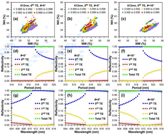 The optimally simulated TE-polarized reflectivities for the fast design of TiO2 HCGs with different values of NW and NH and sidewall angles of θ = 0°, θ = 5°, and θ = 10° are illustrated in Figure 3a–c. The disparate color dots represent the maximum TE-polarized reflectivity searching points, involving information on multiple sets of TiO2 grating periods and the optimized geometric parameters of TiO2 HCGs with a reflectivity of approximately 0.998 to 0.999 for the three sidewall angles. The optimized geometric parameters (NW, NH) are (51–54%, 34–40%), (52.5–55%, 34–38%), and (54–55.5%, 34–37%), respectively. Furthermore, a detailed analysis of period- and wavelength-dependent 0th, 1st, 2nd orders, and total reflectivities for TE-polarized light are presented in Figure 3d–i. As scattering parameters, also known as S-parameters, are the components of frequency-dependent complex-valued matrix and commonly used to calculate the transmittance and reflectance for zero-, first-, and high-order diffraction of electromagnetic waves, this approach has been widely adopted in various fields [,,]. The total reflectivity is a combination of the reflectivity of 0th, 1st, and 2nd order reflections. It is observed from Figure 3d–f that although the total TE-polarization reflectivity remains close to unity, the zeroth-order reflectivity rapidly decreases when the TiO2 grating period exceeds 518 nm. In comparison, the incident light wavelength is fixed at 612 nm.