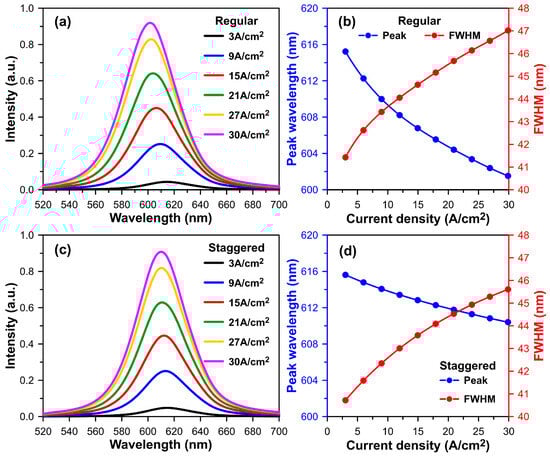 In this subsection, we will conduct a numerical investigation of the optoelectronic characteristics of regular and staggered InGaN multiple quantum well designs. We will then briefly compare these two InGaN-based MQW designs. For the sake of simplicity, our emission spectrum simulation of the InGaN MQW structure still needs to consider the self-heating effect. As a result, Figure 4a,c display the simulated emission spectra of the optical active regions created by the regular (4 nm In0.388Ga0.612N) and symmetric staggered (1 nm In0.217Ga0.783N/2 nm In0.434Ga0.566N/1 nm In0.217Ga0.783N) MQW structure designs under an injection current density ranging from 3 A/cm2 to 30 A/cm2. Two types of InGaN MQWs with different Indium content were selected to emit light with a wavelength close to 615 nm when an injection current density of 3 A/cm2 was applied when the current aperture diameter was assumed to be 10 µm. In addition, the emission peak wavelengths and corresponding full width at half maximum of these two InGaN MQW designs for each current density are methodically listed in Figure 4b,d.