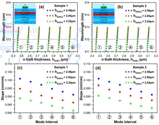Calculated cavity mode wavelengths of proposed InGaN-based red VCSEL unit cell varying with n-GaN thickness, hGaN,t for (a) simulation sample 1: VCSEL with n-p-i-n epi-structure design and (b) simulation sample 2: VCSEL with n-i-p-n epi-structure design. The insets are schematics of two samples. (c,d) indicate the wavelength slopes for six mode intervals found in (a,b). The slope means the n-GaN thickness varies every 1 nm; the longitudinal mode wavelength will be blue- or red-shifted from 0.08 nm to 0.1 nm. The gray lines indicated the target wavelength of 612 nm.