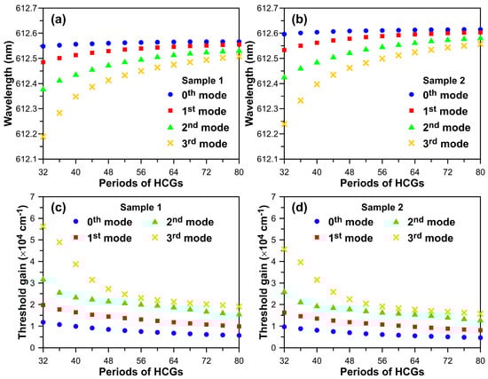 In this section, the HCG pattern size can be treated as the optical aperture size. After the simulation results outlined above, the cavity mode wavelengths and threshold gains of the two-dimensional (2D) InGaN-based red VCSEL model with finite periods of TiO2 high-index contrast gratings will be examined. Initially, the thicknesses of the top and bottom n-GaN layers were set to hGaN,t = 2.72 µm and hGaN,b = 2.85 µm, which serve as an illustrative simulation example.