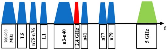 As the capabilities of modern cellular phones continue to increase, more bands must coexist with adjacent cellular frequencies, such as WIFI (2.4 GHz) and L5, between low and mid-high bands. Figure 1 shows the frequency bands that are used for handheld devices. These include satellite-based navigation systems (L5, L1) and low (700–900 MHz), mid (n3–n40), and high (n7, n41, n42, n43) bands for cellular communications as well as WIFI (2.4 and 5 GHz) [].