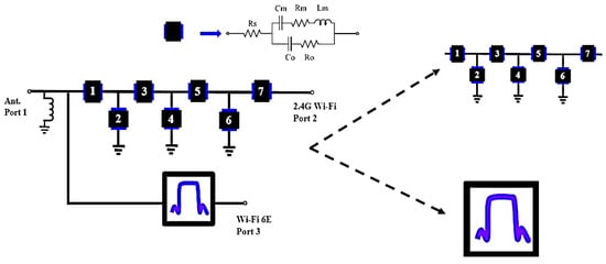 The circuit topology for an upper- and mid-high band (UHB + MHB) diplexer is shown in Figure 4. Port 2 is connected to 2.4 GHz WIFI using a 7th-order ladder-type filter structure. Port 3 connects to the WIFI 6E filter. This architecture requires only a single inductor to perform matching.