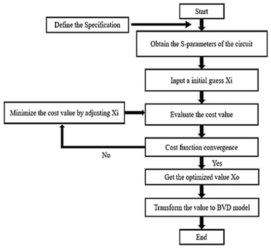 Figure 5 shows a flowchart of the optimization algorithm for the antenna-plexer design, which considers the cost function within the constraints that are discussed in the preceding subsection. This study determines the BVD parameters that minimize the cost function. The specifications for the antenna-plexer are defined in terms of the system requirements to produce the results in Table 1 and Table 2.
