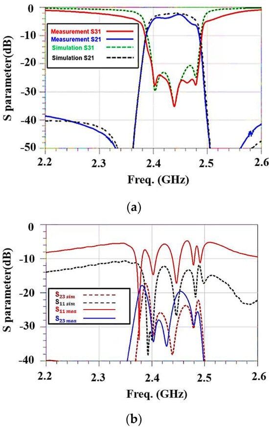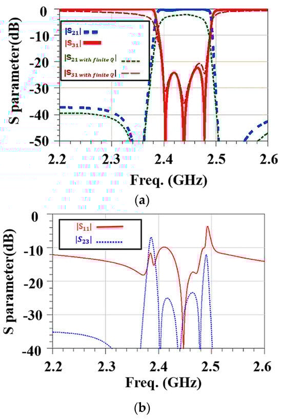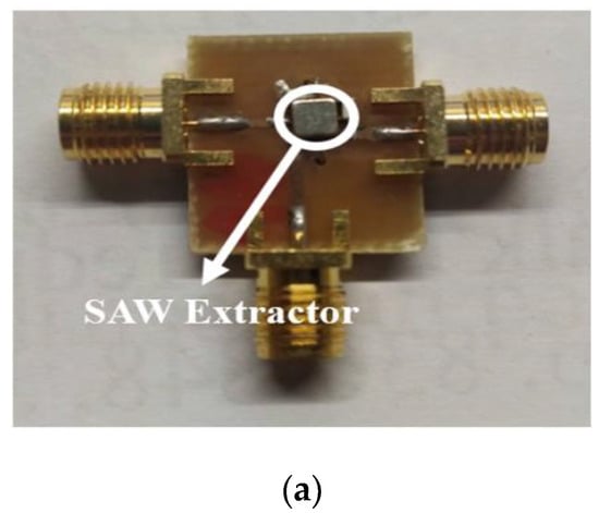 insertion loss to WIFI port 2 is less than 2 dB and to cellular port 3 is greater than 20 dB. Figure 6b shows the frequency responses for and . The return loss in the antenna port in the 2.4 GHz WIFI band is greater than 10 dB, and the isolation between the two output ports is greater than 20 dB. The designed SAW extractor meets the product specifications that are described in Section 2.2.