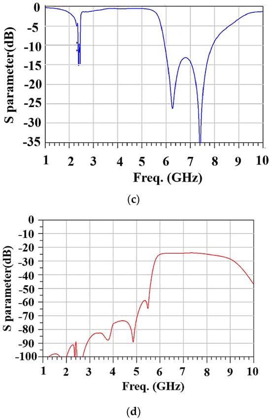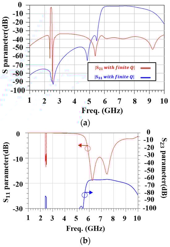 For the UHB + MHB diplexer, the matching circuit structure for this study is shown in Figure 4. It uses a parallel inductor near the antenna port. The value after optimization is shown in Table 4. The design concept for this matching circuit depends on the capacitive characteristics of SAW filters at high and low frequencies. SAW filters create a short circuit at high frequencies and an open circuit at low frequencies, as shown in Figure 11a. The WIFI 6E filter for this study also exhibits similar capacitive characteristics at low frequencies, as shown in Figure 11b.